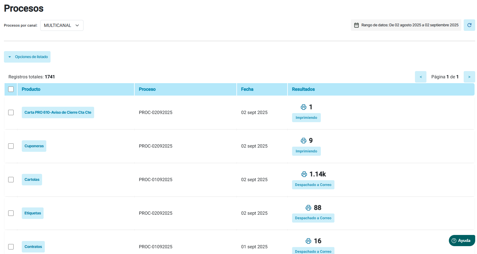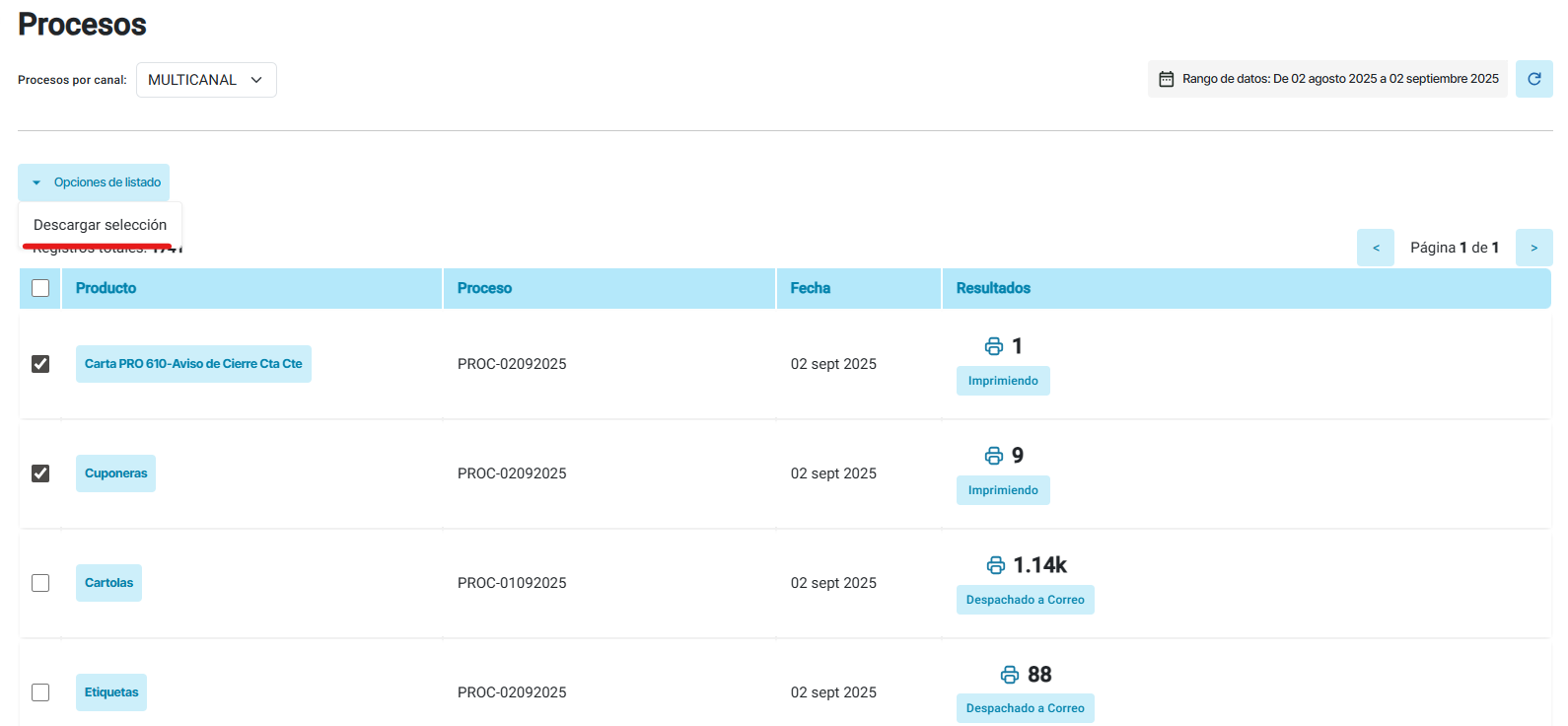 Resultados: estado y cantidad del proceso (ejemplo: Imprimiendo, Despachado a Correo).