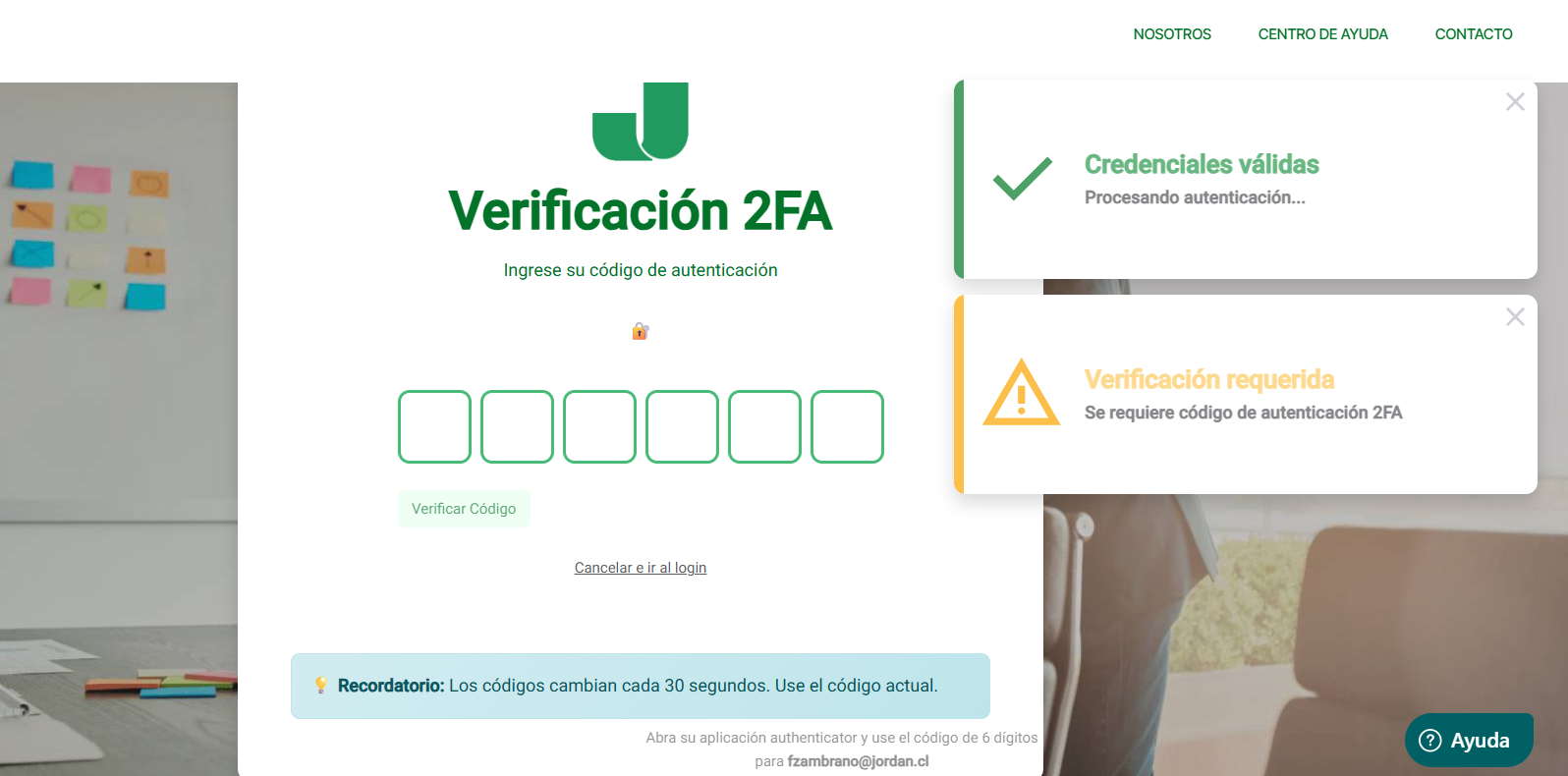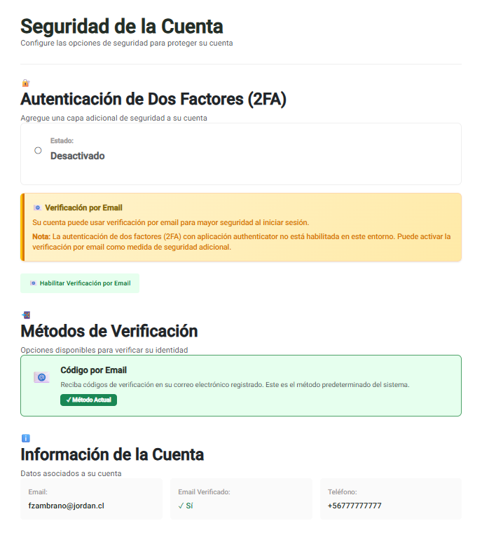El 2FA (doble factor de autenticación) es una medida adicional de seguridad que protege tu cuenta agregando una verificación extra al momento de iniciar sesión. Al activar esta opción, además de tu usuario y contraseña, recibirás un código de verificación de 6 dígitos en tu correo electrónico, el cual deberás ingresar para acceder a la plataforma. Esto reduce significativamente el riesgo de accesos no autorizados.